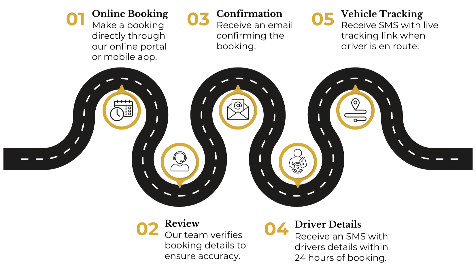 Live Tracking: Once your chauffeur is on the way, you’ll receive an SMS and email with a live GPS tracking link so you can follow their arrival in real time.